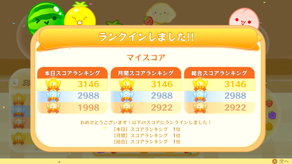 スイカゲーム 日記 X Facebook はてブ LINE Pinterest コピー 2023.10.18 見てたらやりたくなったやつ。流行っているといたるところで目にするので気になってしまいます。 とりあえず3000点以上とったところまで。慣れてきてスイカは結構作れるようになりましたが、スイカを相殺するのはかなり難しそう。