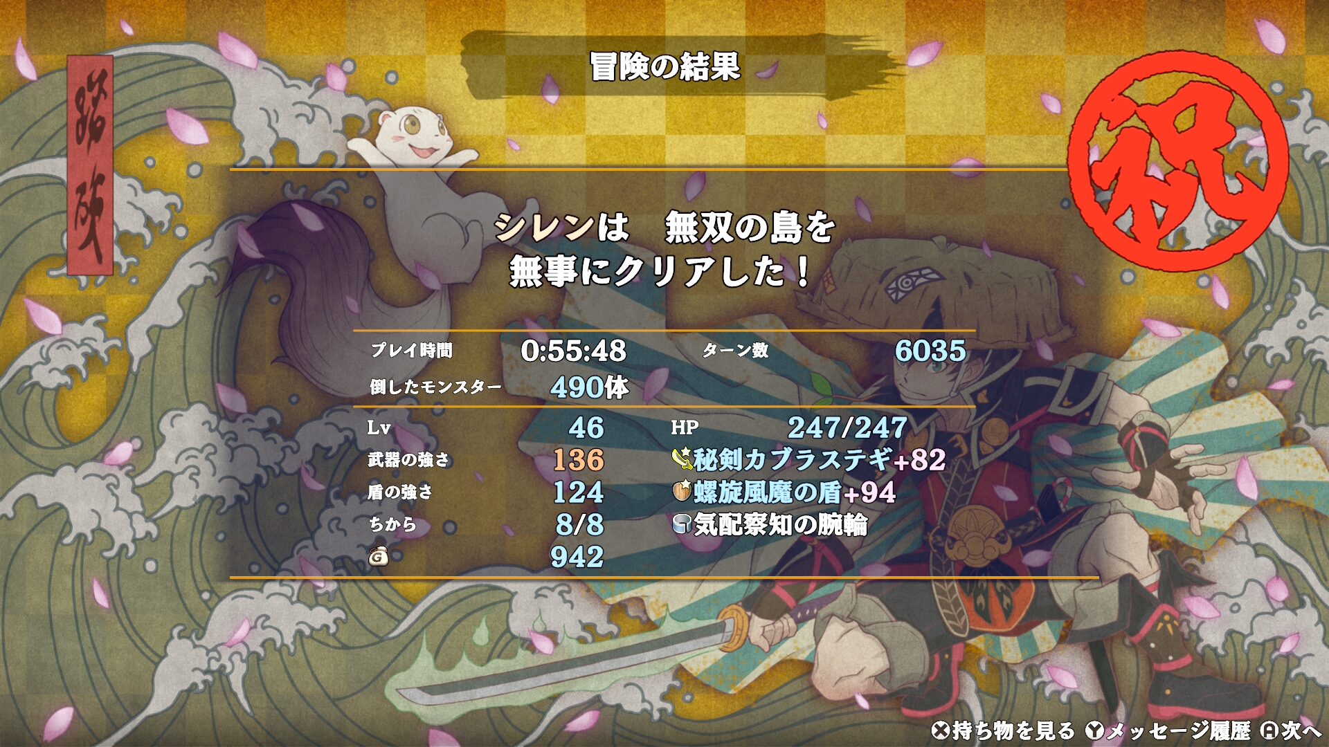 もう結構満足したので追加ダンジョンが来るまではやらないかも。真髄は楽しめたのでやりたくなるかもしれませんが。真髄はなかなか難易度や楽しさの評価がわかれそうですが、個人的には裏白蛇みたいにTAを楽しむというよりはアイテム稼ぎが楽なのでガチガチに強化と対策して降りていくのが楽しかったです。