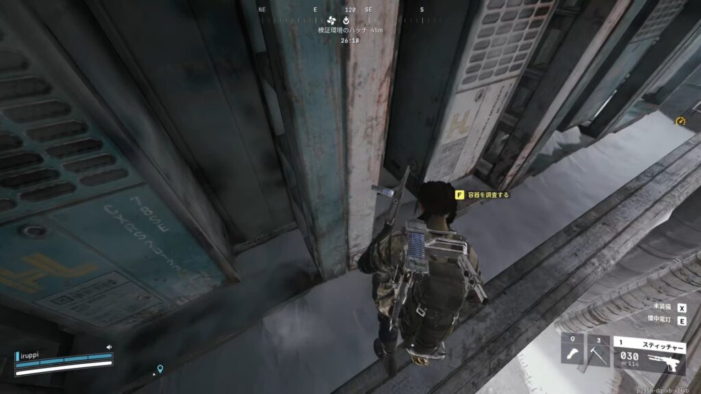飾られた残骸へ行き、通信機を調べる。通信機は残骸のすぐ南。 飾られた残骸は少し登りにくいが、上まで登っていくと武器箱などがある