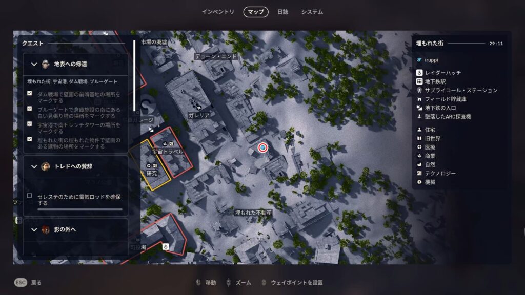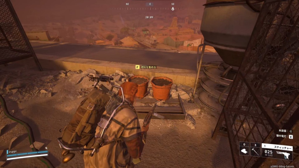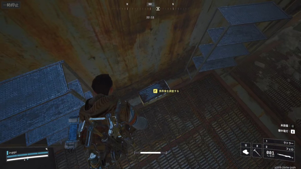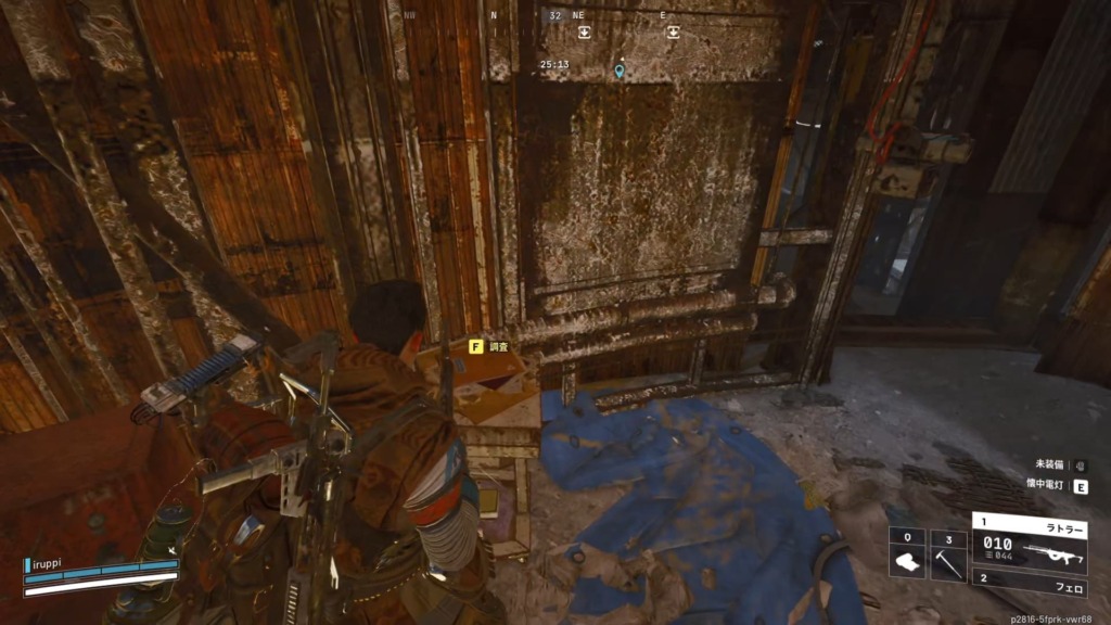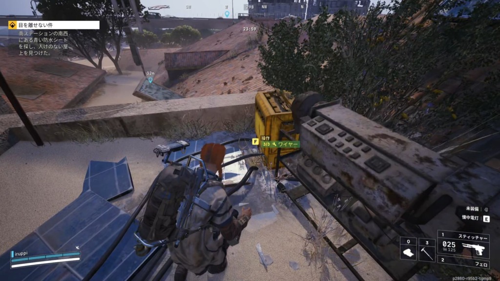 - 南ステーションの南西にある青い防水シートを探し、人けのない屋上を見つける
