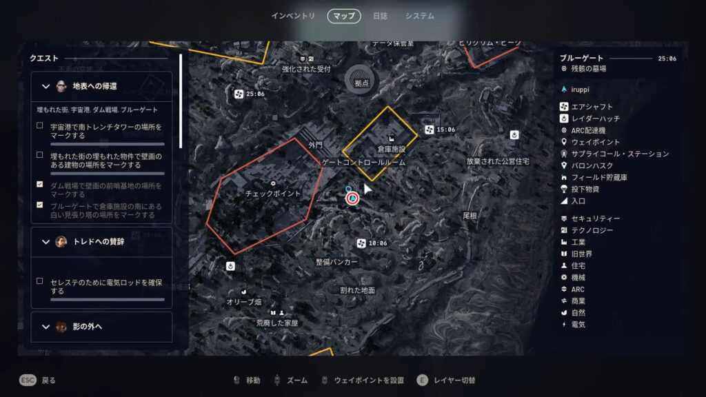 - ブルーゲートで倉庫施設の南にある白い見張り塔の場所をマークする