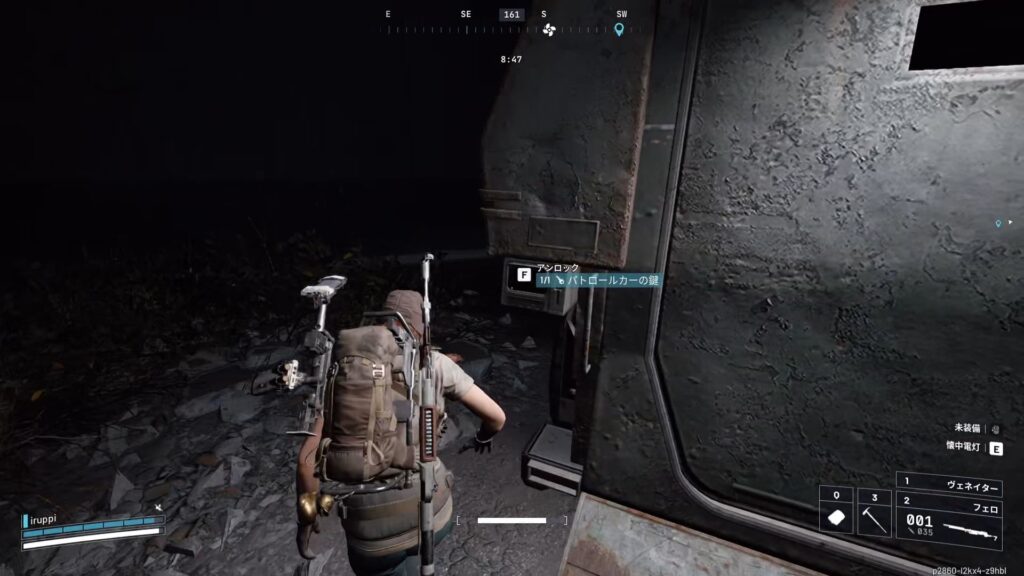 ブルーゲートのチェックポイントに向かい、衛兵の小屋の一番北西側にある小屋からパトロールカーのキーを入手する。キーは安全ポケットに入れられるので入れておくと良い。