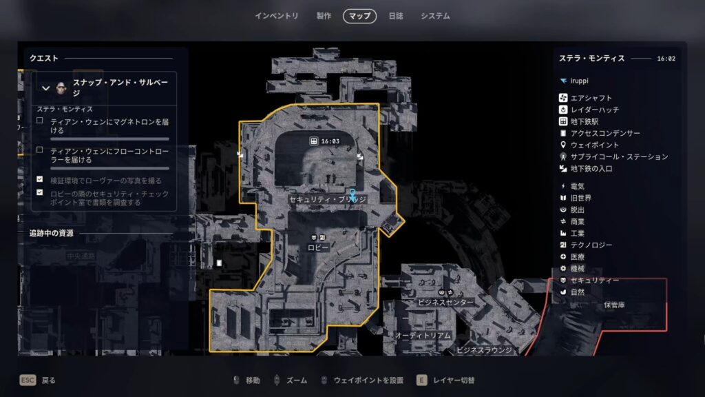 マグネトロンとフローコントローラーはどちらも入手できる場所のアイコンが脱出になっている。ステラ・モンティスでは組み立て場やビジネスセンターが該当。