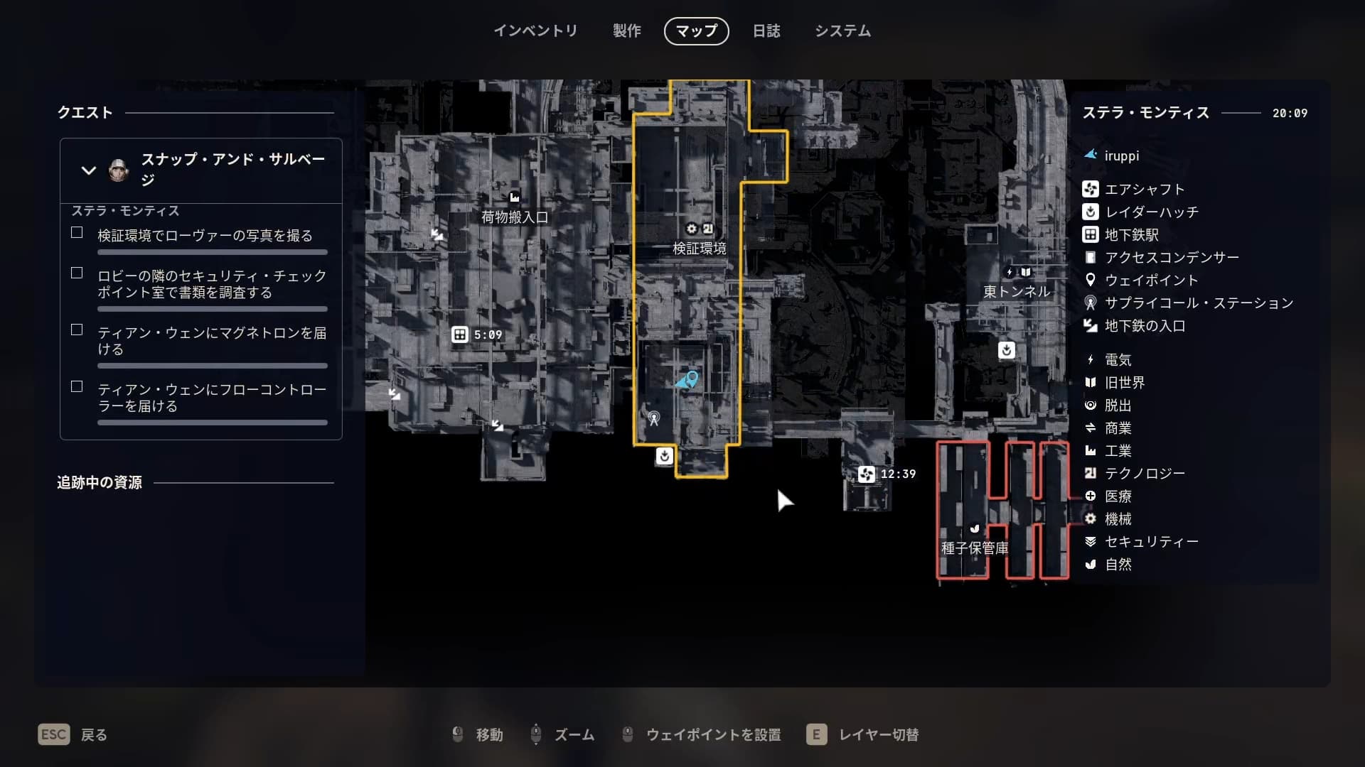 マグネトロンとフローコントローラーはどちらも入手できる場所のアイコンが脱出になっている。ステラ・モンティスでは組み立て場やビジネスセンターが該当。