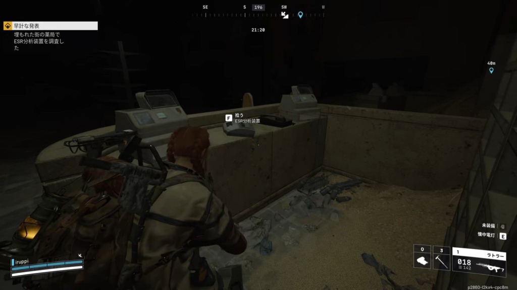 薬局はピアッツァ・アルブストのすぐ南東。入口の扉はバリケードされているので注意。薬局の1階でESR分析装置を調査すると、ESR分析装置が出てくるので拾って帰還するとクリア。