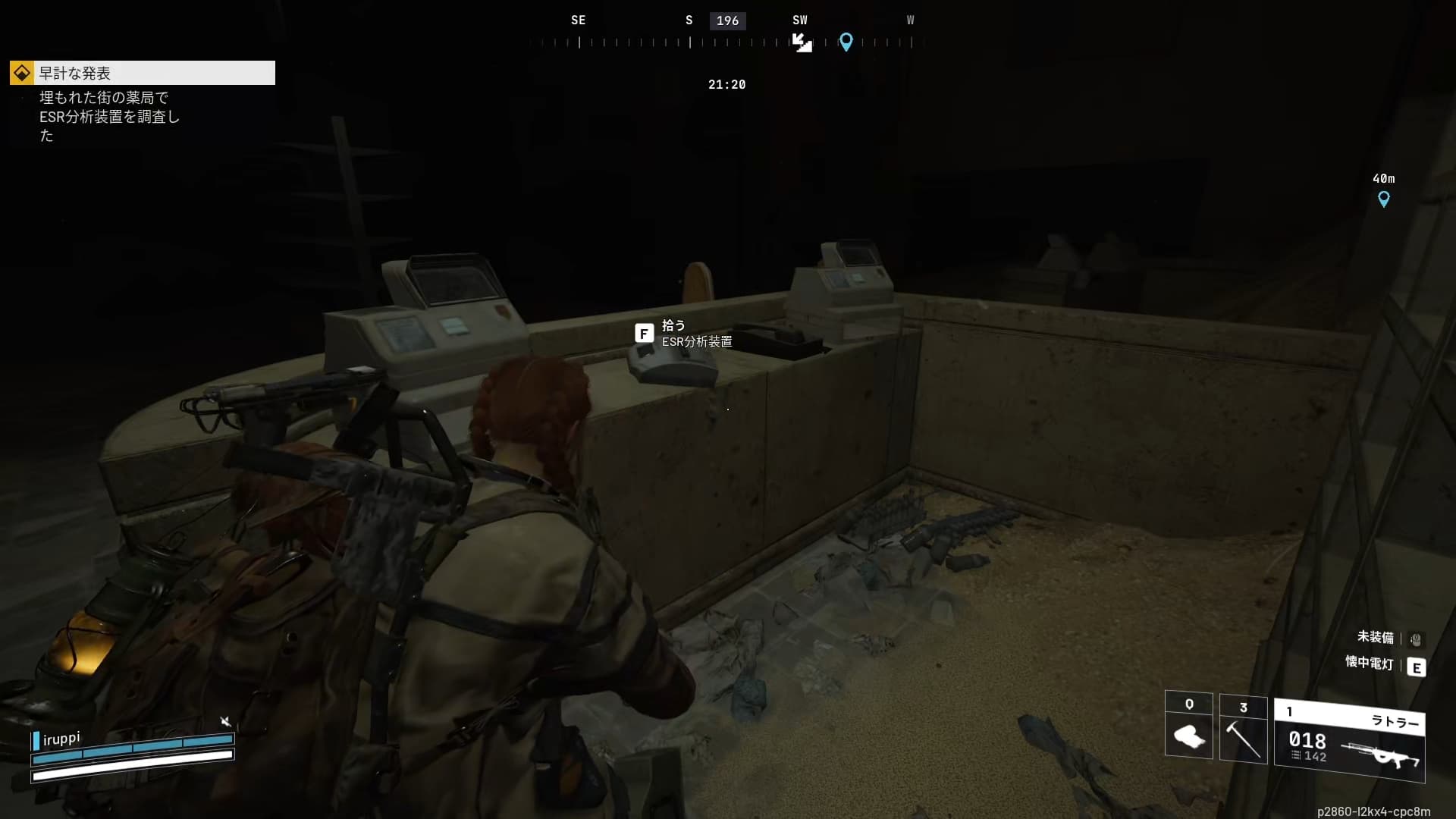 薬局はピアッツァ・アルブストのすぐ南東。入口の扉はバリケードされているので注意。薬局の1階でESR分析装置を調査すると、ESR分析装置が出てくるので拾って帰還するとクリア。