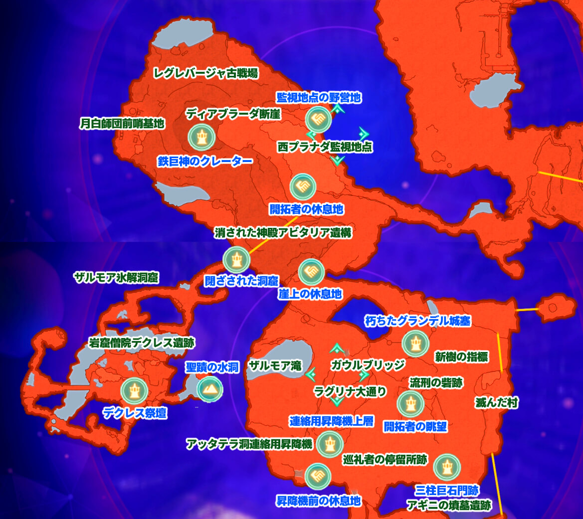 | 6 | アグヌス | 47 | 11 | 月白師団前哨基地 | 入口の扉が閉まっているので、近くの物見櫓から侵入する。出る時は中で手に入る前哨基地の鍵を使用する。また、制圧するとエーテルタワーの製作ができる。 |