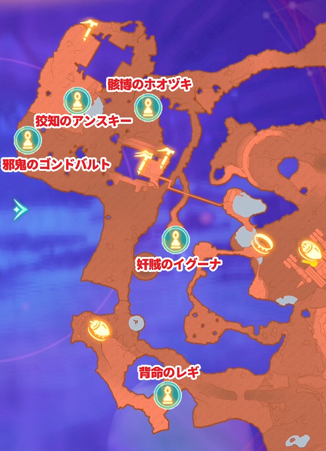 | 狡知のアンスキー | 54 | ユネーの台地 | コレクション ・ランプスの花蜜 ・ランプスの太陽粒子 ・超高純度のジェムストーン アクセサリ ・煌めくメダル ・つながりの結晶 貴重品 ・ノポンコイン・金 ・ノポンコイン・銀 ・謎の欠片・四角 |