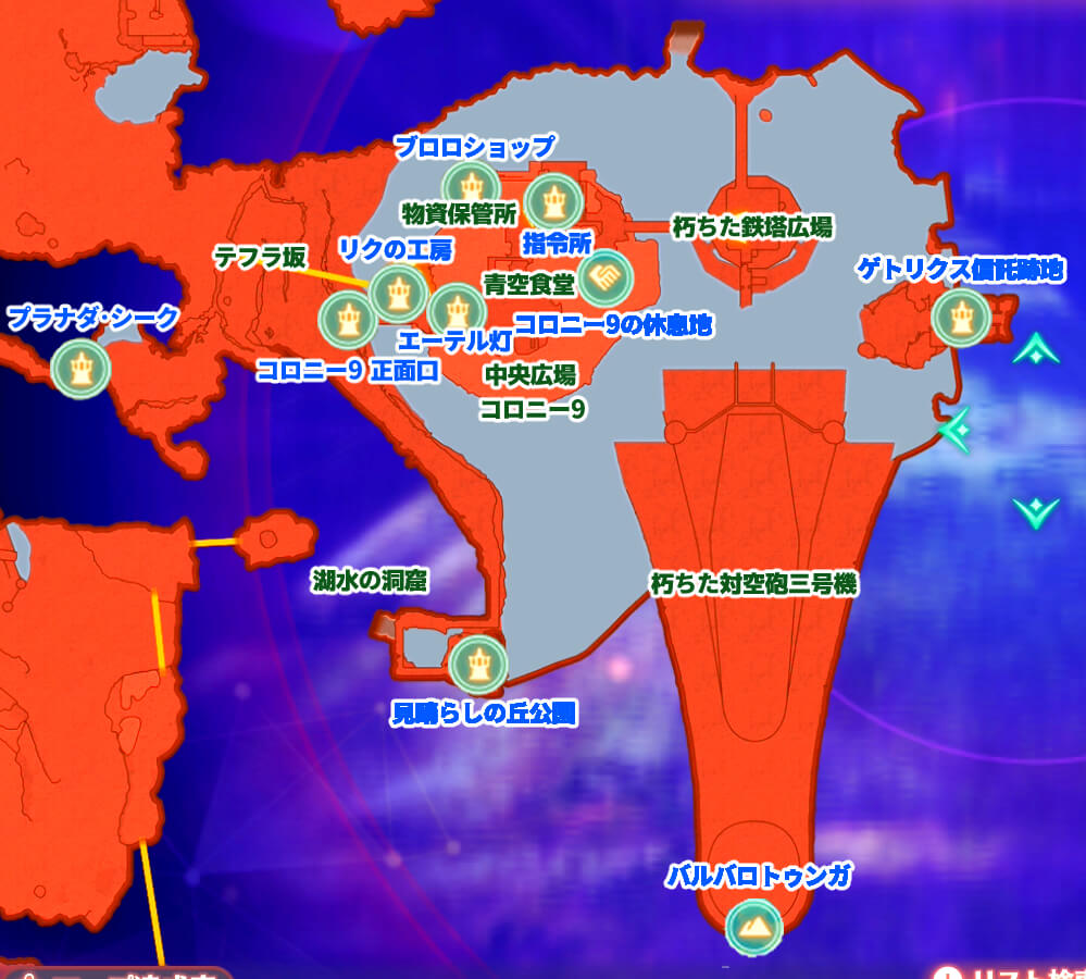| 2 | ゲトリクス信託跡地 コロニー9の東の陸地 | ・ブレイドストーン×6 ・高純度のジェムストーン×2 ・アーツ解放キット ・作戦指南書・第一巻 ・闘気のはちまき ・2660G |
